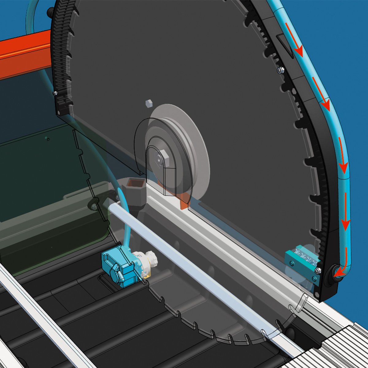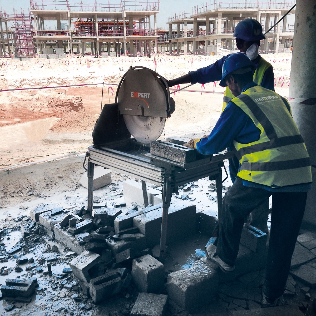 EXPERT is a masonry saw ideal for the building sector.Innovative design with high tech solutions, very precise, compact, light and strong, it's suitable for cutting bricks, poroton blocks, marble blocks and all the different kind of materials for the building sector. TT Power The logo which identify the uniqueness of the electric motors manufactured by Battipav, which is the only company in the cutting machines industry able to develop and manufacture the electric motors that power their saws. AxT(Water for cutting): This trademark represents the winning association between submersible pump and masonry saw. The trademark symbolizes originality and high quality Spray system Diamond blade cooling system. It works on the three vital points of the diamond tool: on the front and on both sides of the rim. It has great efficiency also for 45 degrees cuts. It prevents cutting dust and improves the life of the diamond tool, by creating a flow of misty water inside the blade guard. Fast Leg The system which makes the storage of the machine much easier. This system ensures more rigidity and steadiness when operating, and allows to stack up to three machines on one pallet. This reduces the encumbrance of the machine by eliminating the packaging. W Dec Water-decanting system: the original shape of the water tray prevents the grout to accumulate in the pump area, so allowing the pump to use always clean water. Adjustable head Adjustament system of the cutting height with a hand wheel and relevant locking lever. Possibility to make cuts with 2 RUNS. Structure Aluminium draw-plate to get the maximun of rigidity and lightness at the same time. It has four handles for the carriage and movement. Handle on the working table To get the maximum safe to the operator. Working table The working table is very strong and steady. It slides on 2 steel square rails with 6 wheels; 4 over and 2 under. Every wheel has 2 ball bearings for a total of 12. Disk brake security (optional) A braking system for three-phased motors, which allow a very fast complete stop of the disk after the saw switch-off.