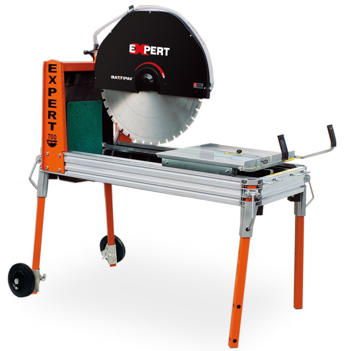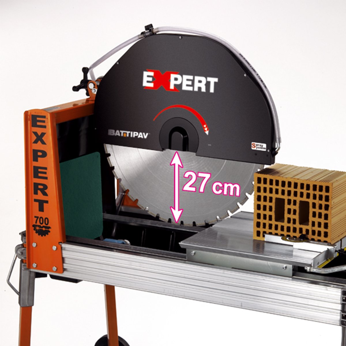 <p>EXPERT is a masonry saw ideal for the building sector.Innovative design with high tech solutions, very precise, compact, light and strong, it's suitable for cutting bricks, poroton blocks, marble blocks and all the different kind of materials for the building sector. <strong>TT Power </strong>The logo which identify the uniqueness of the electric motors manufactured by Battipav, which is the only company in the cutting machines industry able to develop and manufacture the electric motors that power their saws.<strong> AxT</strong>(Water for cutting): This trademark represents the winning association between submersible pump and masonry saw. The trademark symbolizes originality and high quality<strong> Spray system </strong>Diamond blade cooling system. It works on the three vital points of the diamond tool: on the front and on both sides of the rim. It has great efficiency also for 45 degrees cuts. It prevents cutting dust and improves the life of the diamond tool, by creating a flow of misty water inside the blade guard.<strong> Fast Leg </strong>The system which makes the storage of the machine much easier. This system ensures more rigidity and steadiness when operating, and allows to stack up to three machines on one pallet. This reduces the encumbrance of the machine by eliminating the packaging.<strong> W Dec </strong>Water-decanting system: the original shape of the water tray prevents the grout to accumulate in the pump area, so allowing the pump to use always clean water.<strong> Adjustable head </strong>Adjustament system of the cutting height with a hand wheel and relevant locking lever. Possibility to make cuts with 2 RUNS.<strong> Structure </strong>Aluminium draw-plate to get the maximun of rigidity and lightness at the same time. It has four handles for the carriage and movement.<strong> Handle on the working table </strong>To get the maximum safe to the operator.<strong> Working table </strong>The working table is very strong and steady. It slides on 2 steel square rails with 6 wheels; 4 over and 2 under. Every wheel has 2 ball bearings for a total of 12.<strong> Disk brake security (optional) </strong>A braking system for three-phased motors, which allow a very fast complete stop of the disk after the saw switch-off.</p><p><strong>Accessories:</strong></p><p><strong>Included: </strong><br>Wheels kit<br><strong>Optional: </strong><br>Sound rotation security<strong> </strong>45° Angle cutting accessory</p>
