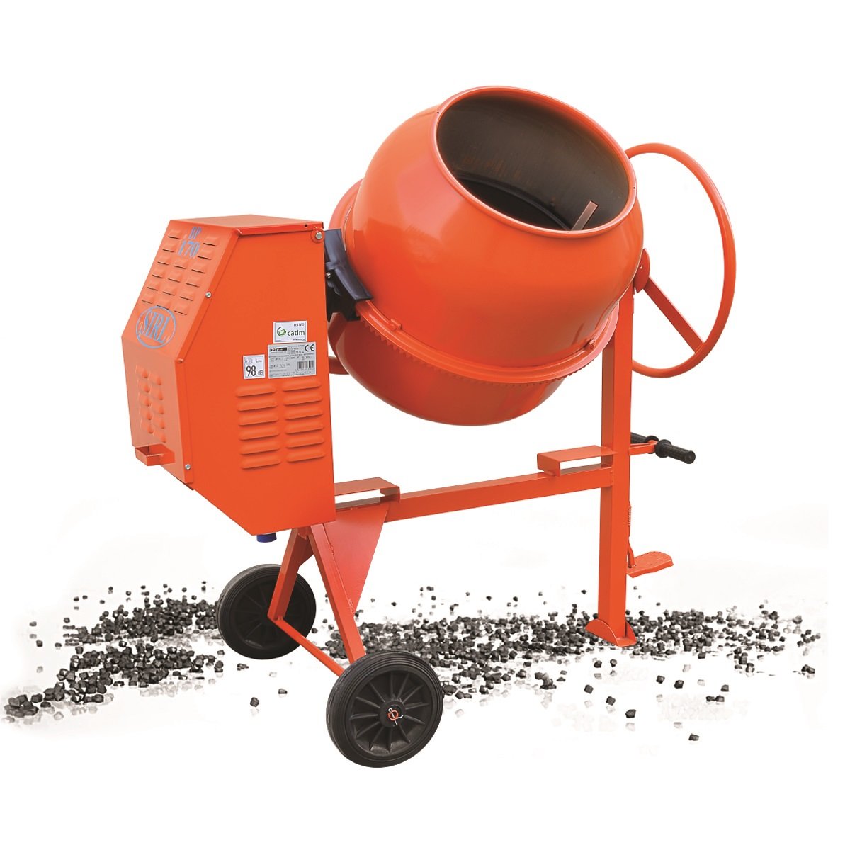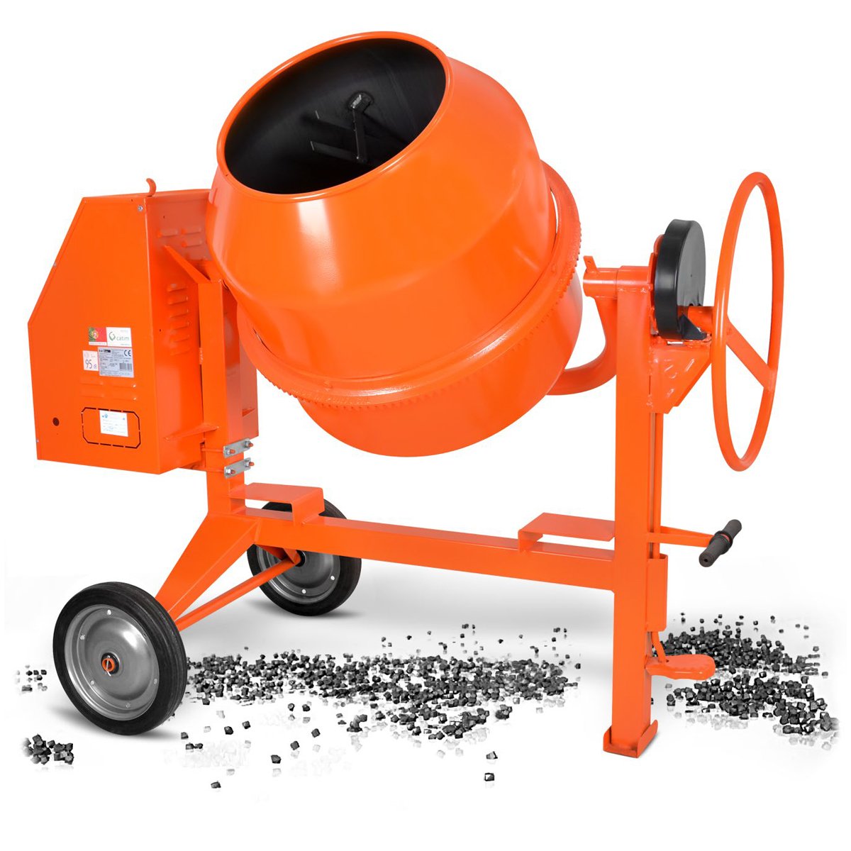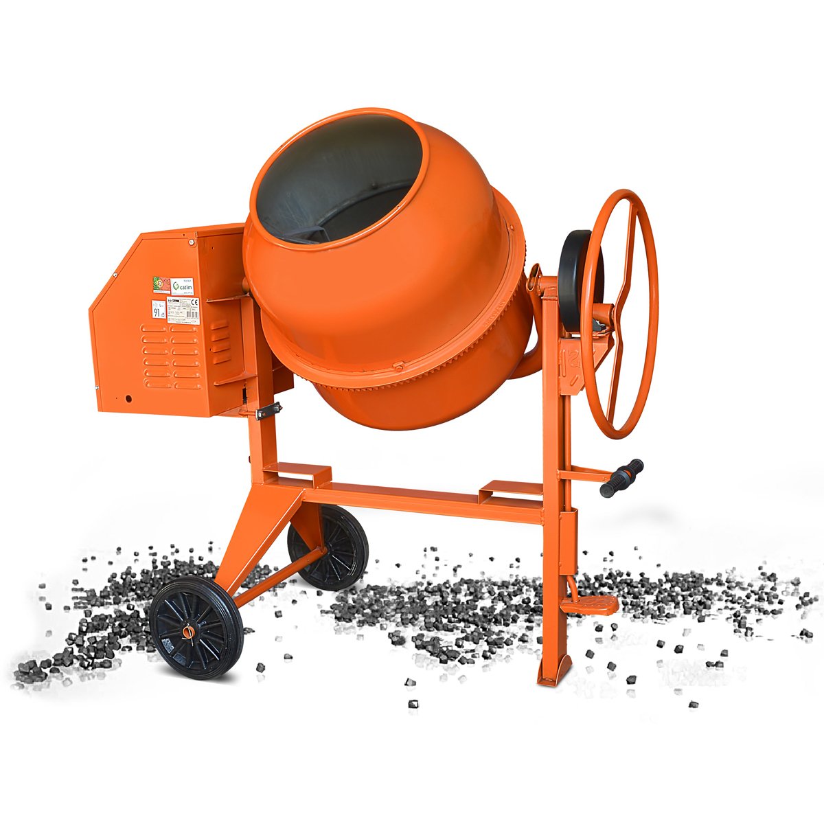 Drum with Reinforced Opening and 3 Double Mixing Blades Lubrication Point Cast Iron Pinion Handles for Discharge Poly - V Iron and Trapezoidal Belt Forklift Pockets Epoxy Paint Finishing Reinforced Structure