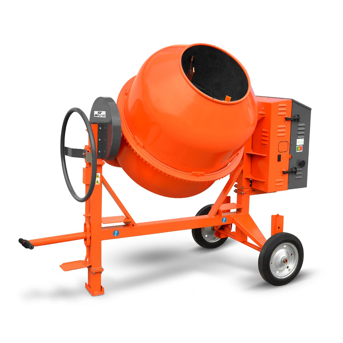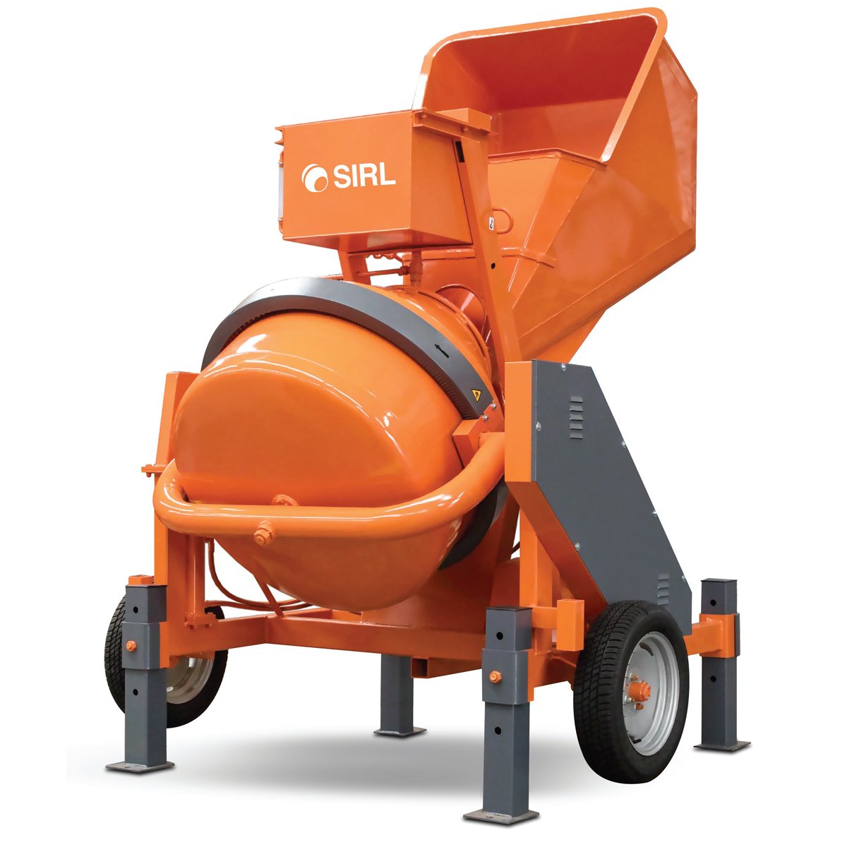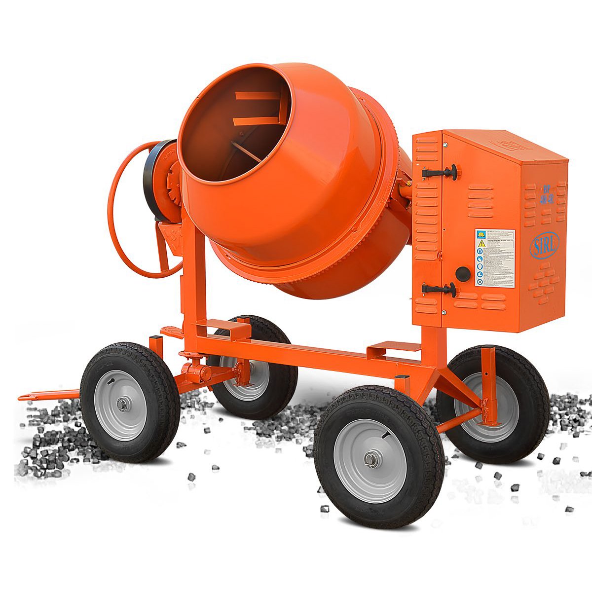 Drum with Reinforced Opening and 3 Double Mixing Blades Lubrication Point Cast Iron Pinion Handles for Discharge Poly - V Iron and Trapezoidal Belt Forklift Pockets Epoxy Paint Finishing Reinforced Structure