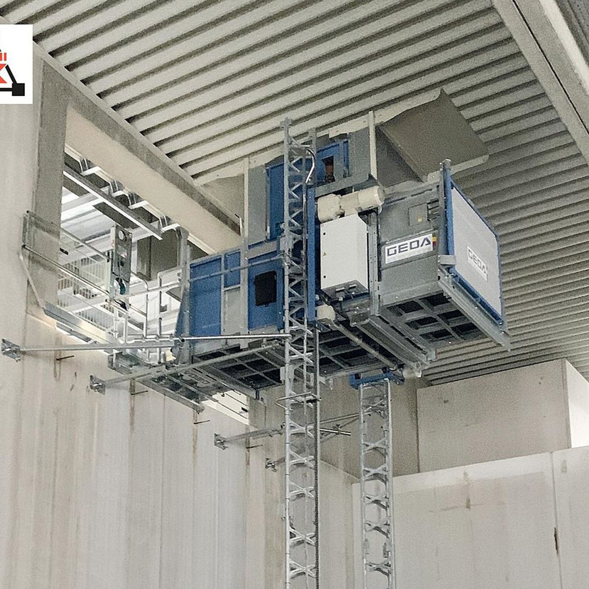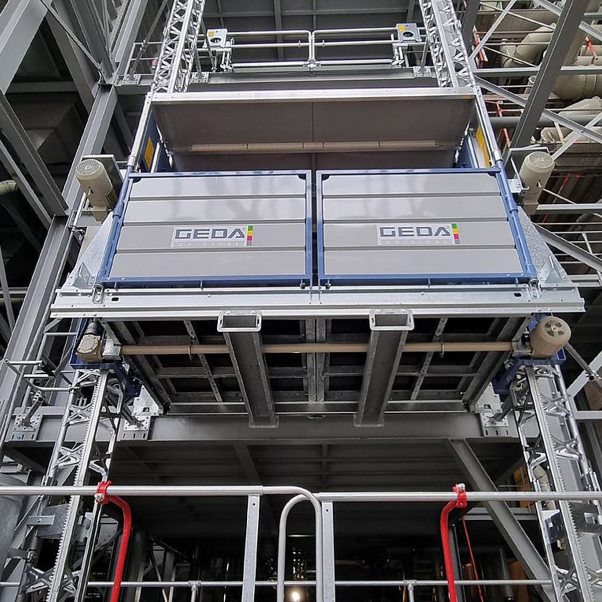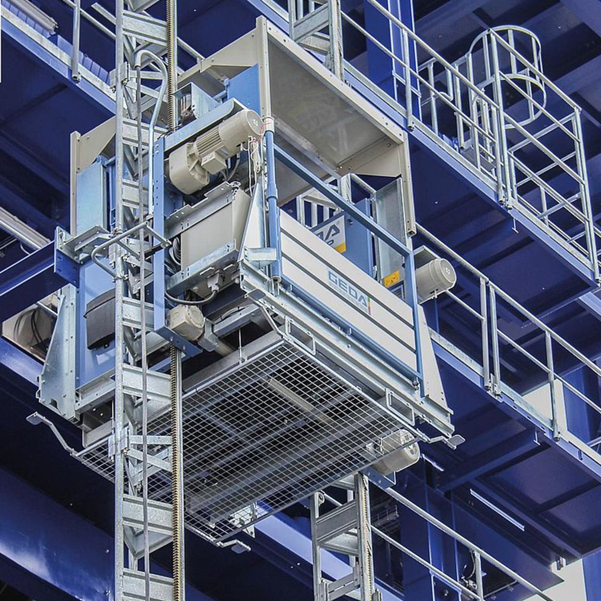 The GEDA 1500 ZP P is a high-performance transport platform designed for permanent installation in industrial, warehousing, and logistics environments. With a load capacity of up to 2,000 kg or 7 passengers and a lifting height of up to 100 metres, it offers a powerful and efficient solution for transporting both personnel and materials safely and quickly.Guided on dual mast structures, the system ensures low anchoring forces on building façades, making it suitable for integration into a wide range of structural layouts. Its four available platform variants allow for flexible application based on site-specific requirements.Commonly used for maintenance and repair tasks, the GEDA 1500 ZP P significantly improves operational efficiency and access in vertical transport operations.
