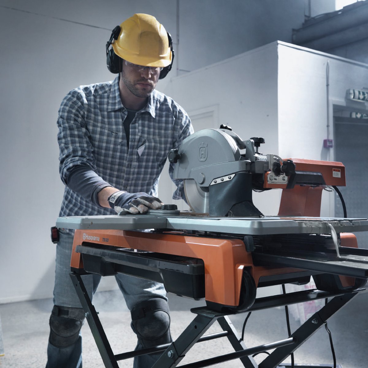 TS 60 is an efficient universal masonry saw with high cutting capacity for all kinds of bricks and building blocks. With this table saw you get a maximum cutting depth of 100 mm in one pass or up to 150 mm by step cutting. You can easily plunge or bevel cut at 45 degrees for maximum versatility. The robust single-piece frame with integrated conveyor rails gives great rigidity and provides longer product life. Clean work area The Jet Stream Water Containment System keeps water and slurry in the cart trench, making it ideal for cutting indoors. Easy transport The low weight, foldable legs and stable wheels facilitate transportation. Flexible cutting method Switches between plunge cuts and MITRE cuts with ease. Ideal for long cutting The maximum cutting length of 700 mm and the large cutting table allows you to cut 50x50 cm tiles diagonally. Jet Stream Water Containment System Keeps water and slurry in the cart trench, making it ideal for cutting indoors. Adjustable cutting head Enables bevel cuts between 22.5 and 45 degrees. Diverse sawing You can do plunge, MITRE and angled cuts Easy to clean table The large removable cutting table is easy to clean. No need to refill water Thanks to the refined recycling system which cleans water for reuse. Overload protection The ElgardTM overload protection system allows you to always cut at maximum speed, for best performance. Elgard™ LED indication for machine overload provides increased productivity and motor life. Easy angle cutting Angle guide and adjustable stand are included to facilitate cutting. Electronic SoftStart™ Provides starting with normal, slow acting fuses. Smooth start with normal fuses Softstart™ maintains high productivity even with normal fuses